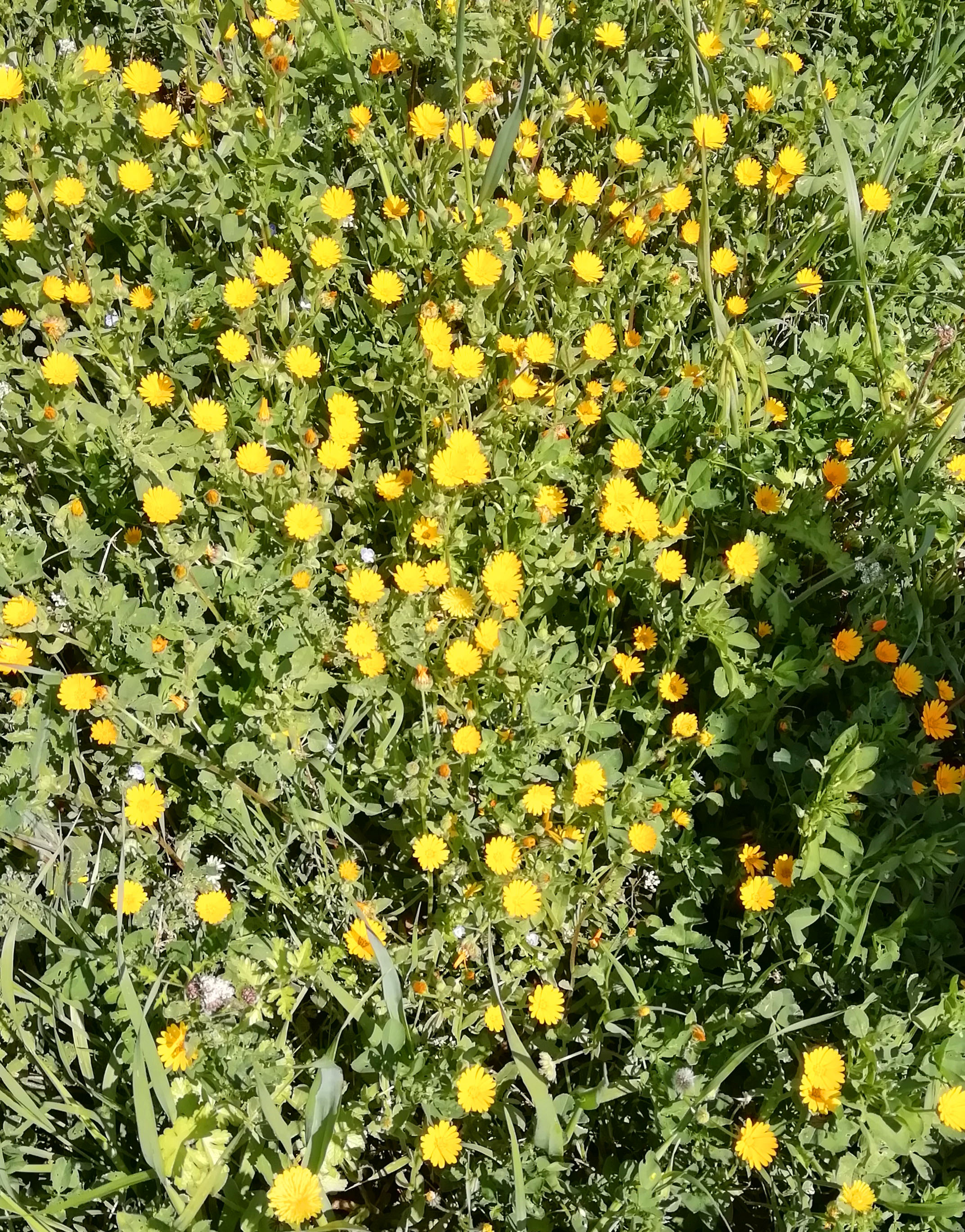 C’era un magnifico campo costellato di puntini gialli a perdita d’occhio, erano calendule minute e graziose così ci siamo messe al lavoro. Avevano bellissime e perfette, piccole corolle seriche con un profumo meraviglioso, pungente e aromatico, la resina che si attaccava alle dita e appiccicava un pò. Man mano che si riempiva il sacchetto di tela le guardavo e mi sembrava di aver raccolto dell’oro liquido, mi comunicavano allegria ed un’energia che non era commisurata alla loro dimensione.