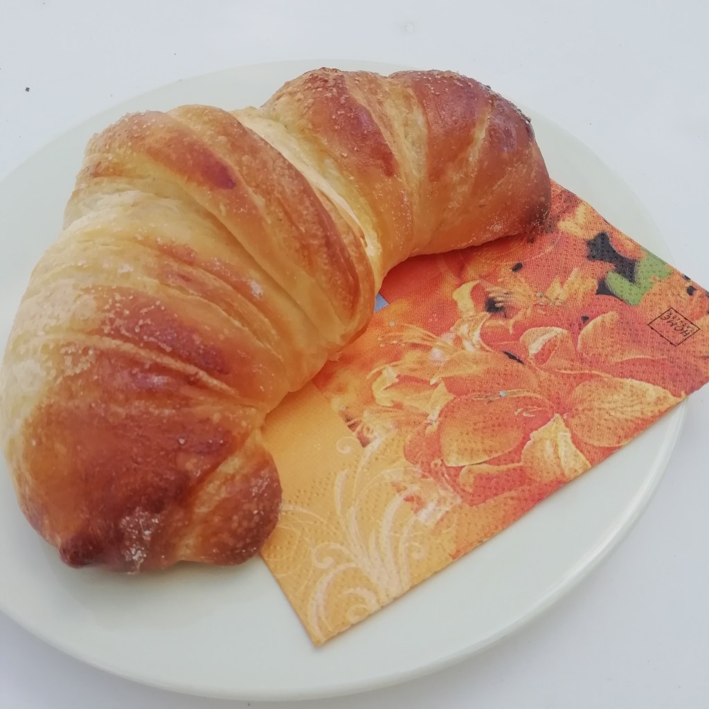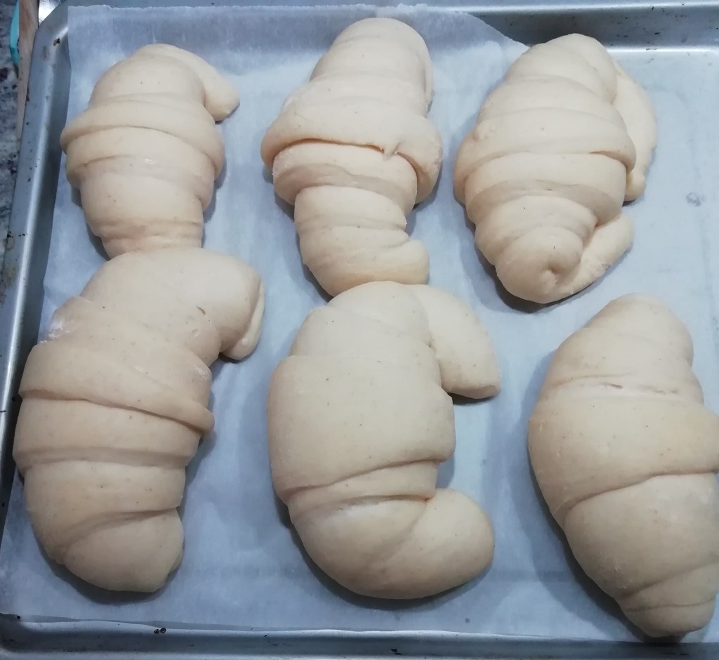 Una volta fatta questa operazione posizionare i cornetti sulla placca per la cottura, ben distanziati, coprire con un telo e mettere in forno spento a lievitare con gli stessi accorgimenti della volta precedente. Andate a dormire sereni e la mattina i croissants saranno circa triplicati di volume. Toglieteli dal forno e accendetelo. Io ho messo 160/170° ventilato e mentre si scaldava ho sbattuto un uovo e ho pennellato delicatamente la superficie di ciascun dolce, poi ho cosparso con poco zucchero semolato. Ho infornato e in 15 minuti erano cotti. Me ne sono usciti 11, ma i primi, una volta lievitati avevano le dimensioni di un pane toscano, quindi se ne possono fare almeno 12 o 14.