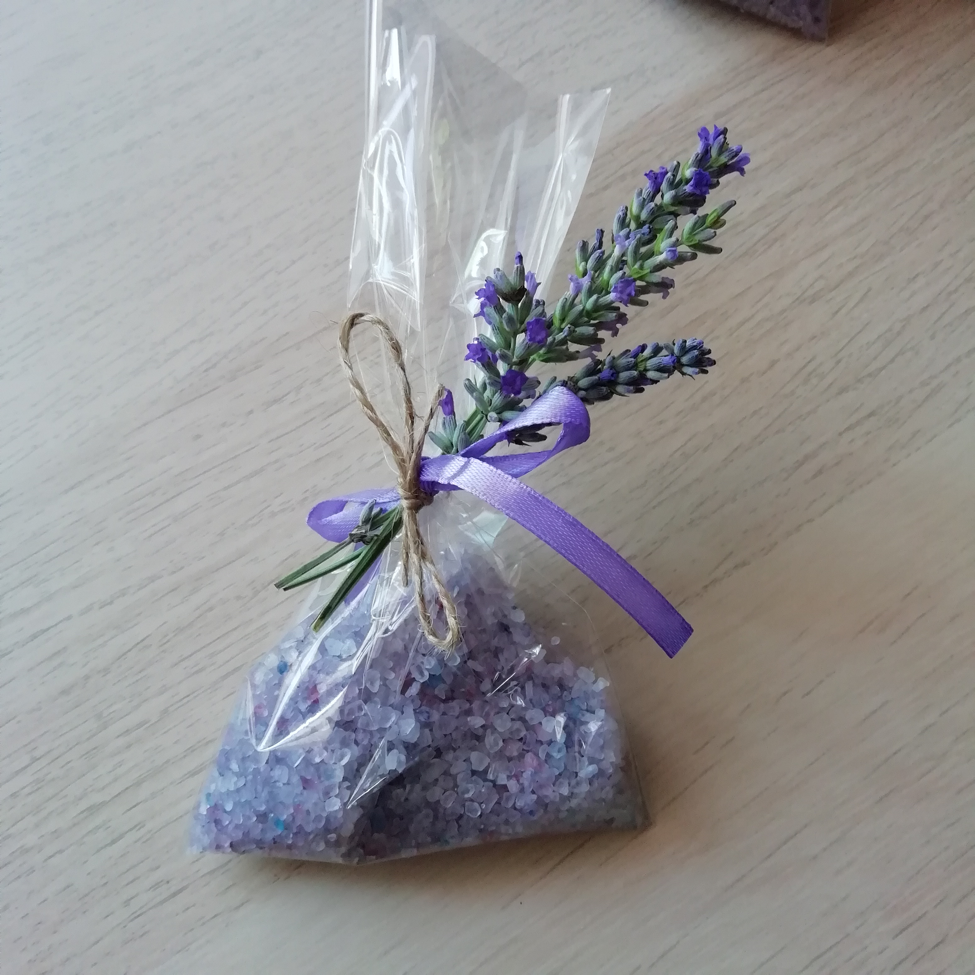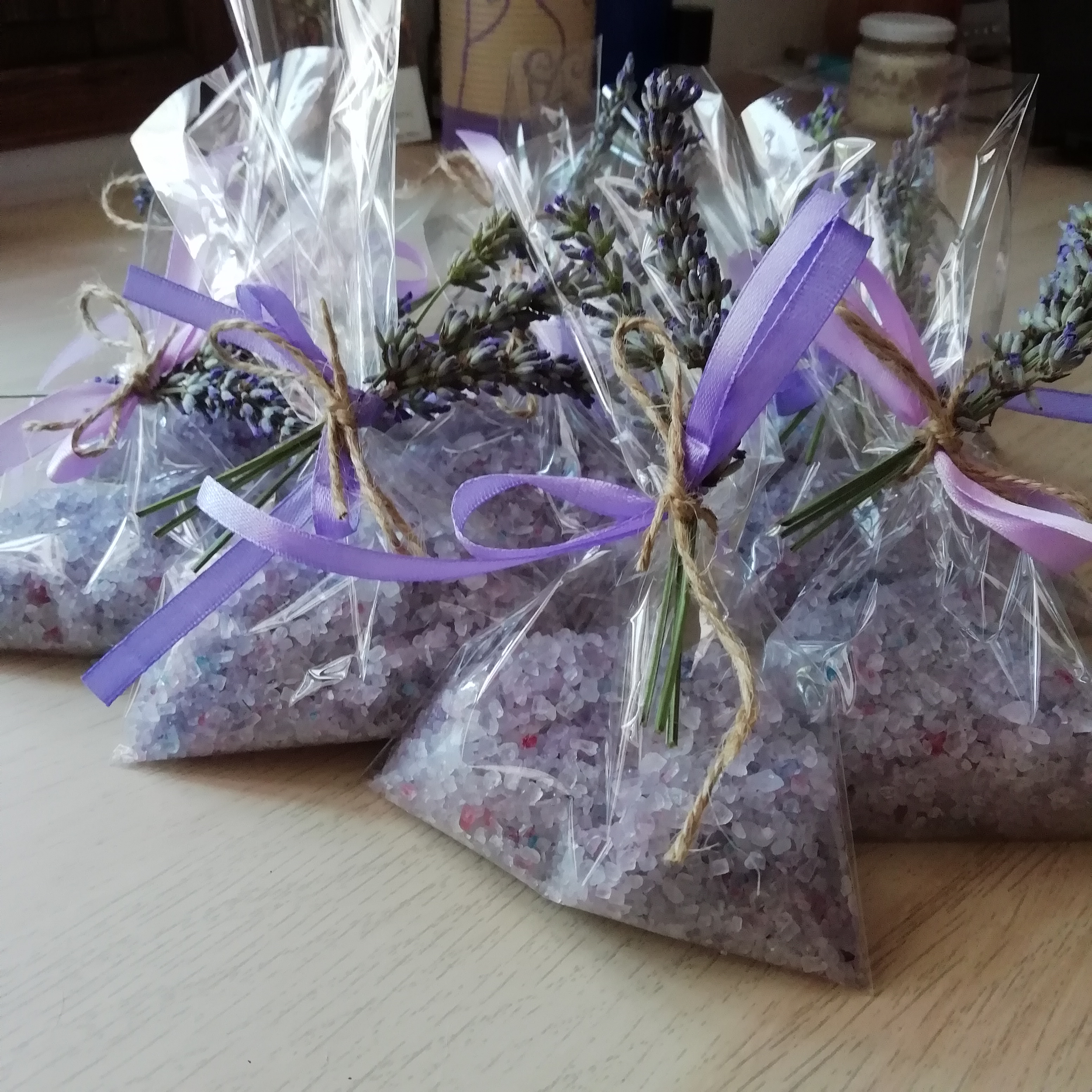 Sono Sacchetti di sali da bagno alla lavanda chiusi da tre spighe di lavanda.