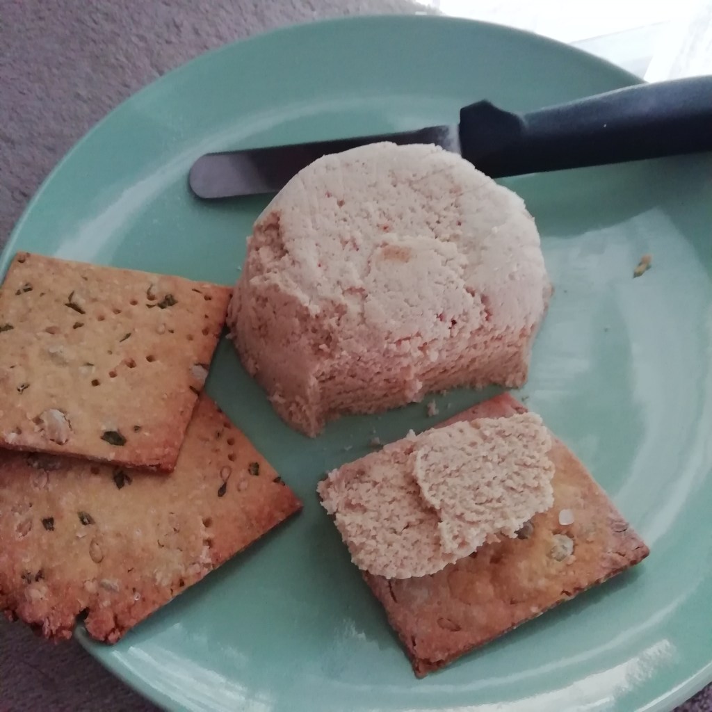 Mescolare, compattare in un contenitore e servire spalmando su cracker, gallette o pane. Nella foto sono cracker di ceci.