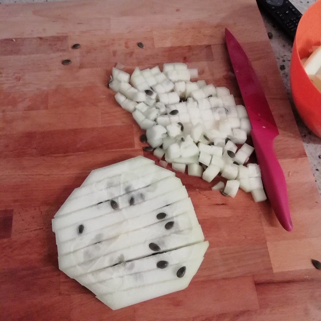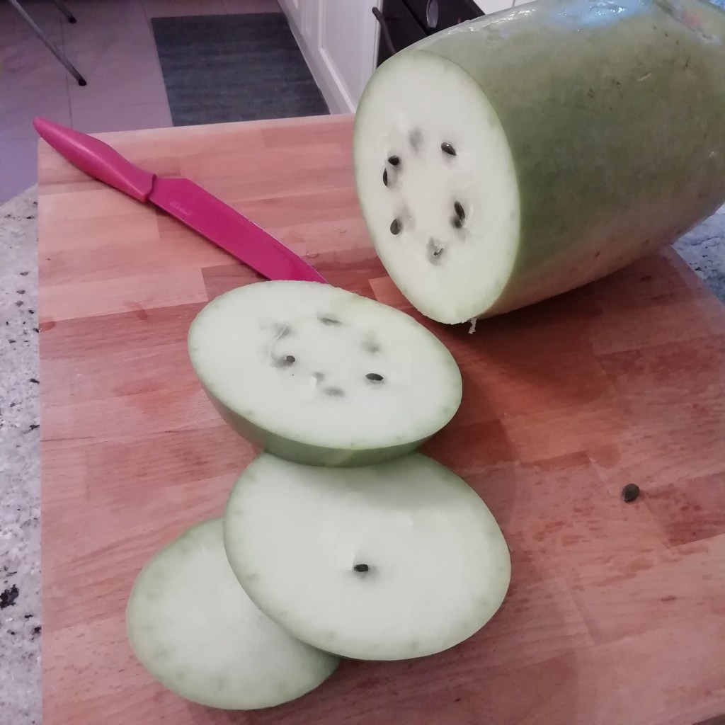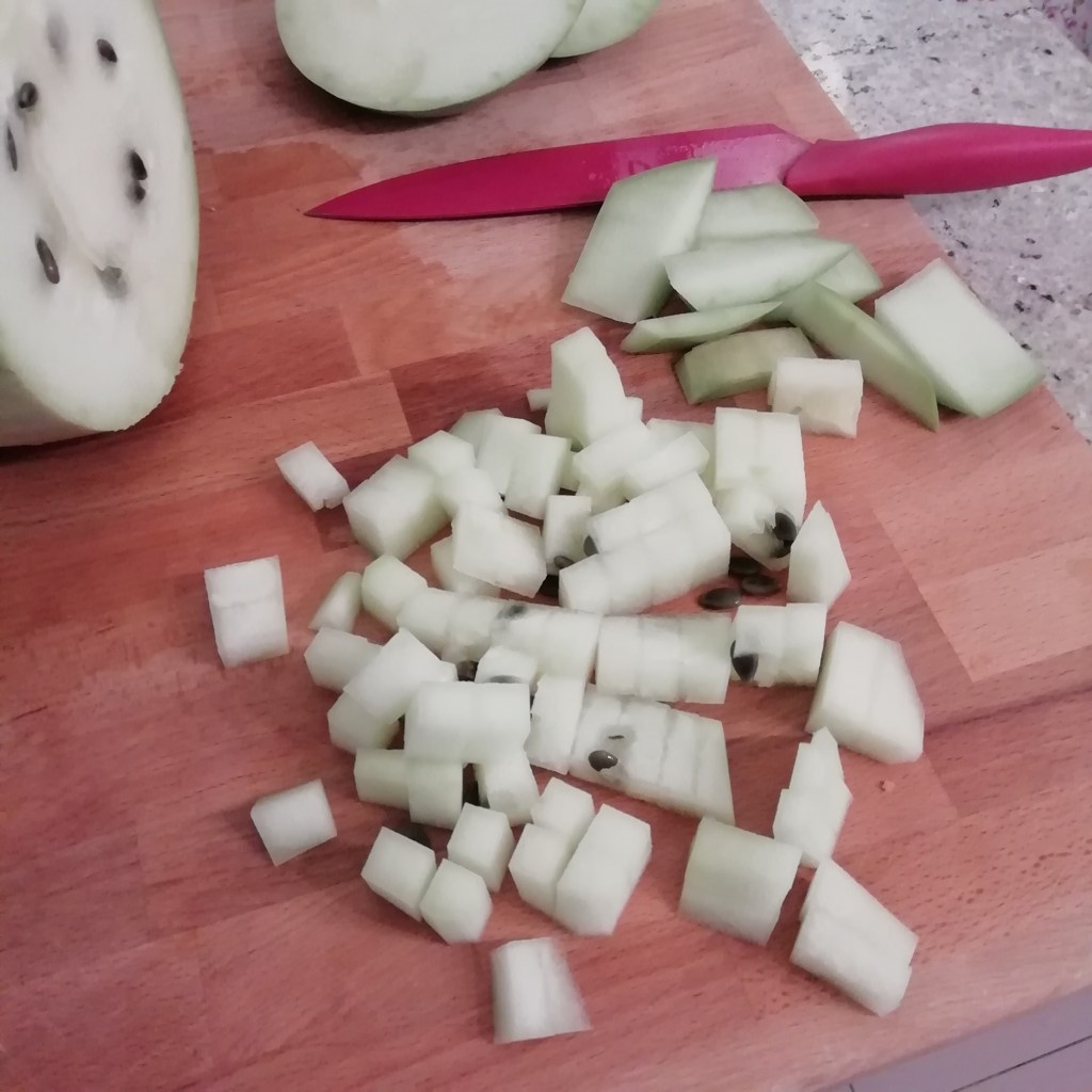 Esiste una varietà di cocomero che all’interno è bianco, è una di quelle piante poco conosciute e poco coltivate perché da crudo non ha nessun sapore, ha un odore fresco da cetriolo a non è molto utilizzabile in cucina così com’è ma dalle mie parti, in Romagna, è ben conosciuto e stimato per fare la marmellata. Anzi da bambina non conoscevo altri tipi di marmellata.