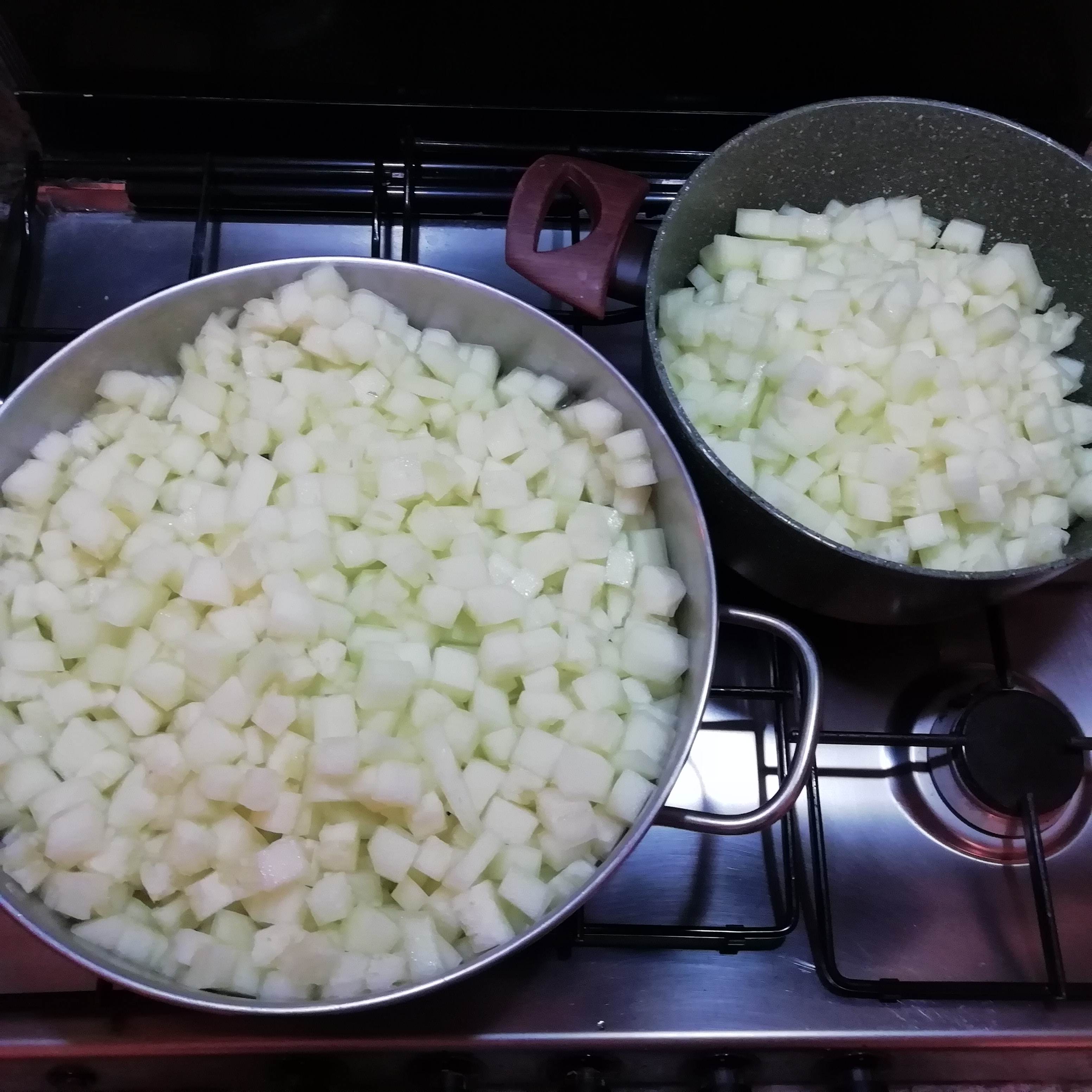 Ricordo dalla zia quando si preparava, in grosse quantità ovviamente per ottimizzare il tempo e il lavoro, tutti davamo una mano e diventava una festa quasi come la vendemmia. Lo zio tagliava il grosso cocomero, o meglio “la cocomera da marmellata” al femminile, a fette e le donne, eliminavano la scorza e tagliavano a quadretti la polpa togliendo anche i numerosi semini. Questo ultimo compito era anche mio ed era piuttosto noioso, ma mi facevo cullare e quasi ipnotizzare dalle voci degli adulti che parlavano, raccontavano, scherzavano. Una volta tagliato veniva messo un grossi tegami appositi che si tiravano fuori per queste occasioni, si metteva sopra lo zucchero e il limone (buccia e polpa tagliata a pezzetti) e si lasciava riposare qualche ora perché uscisse l’acqua di vegetazione.