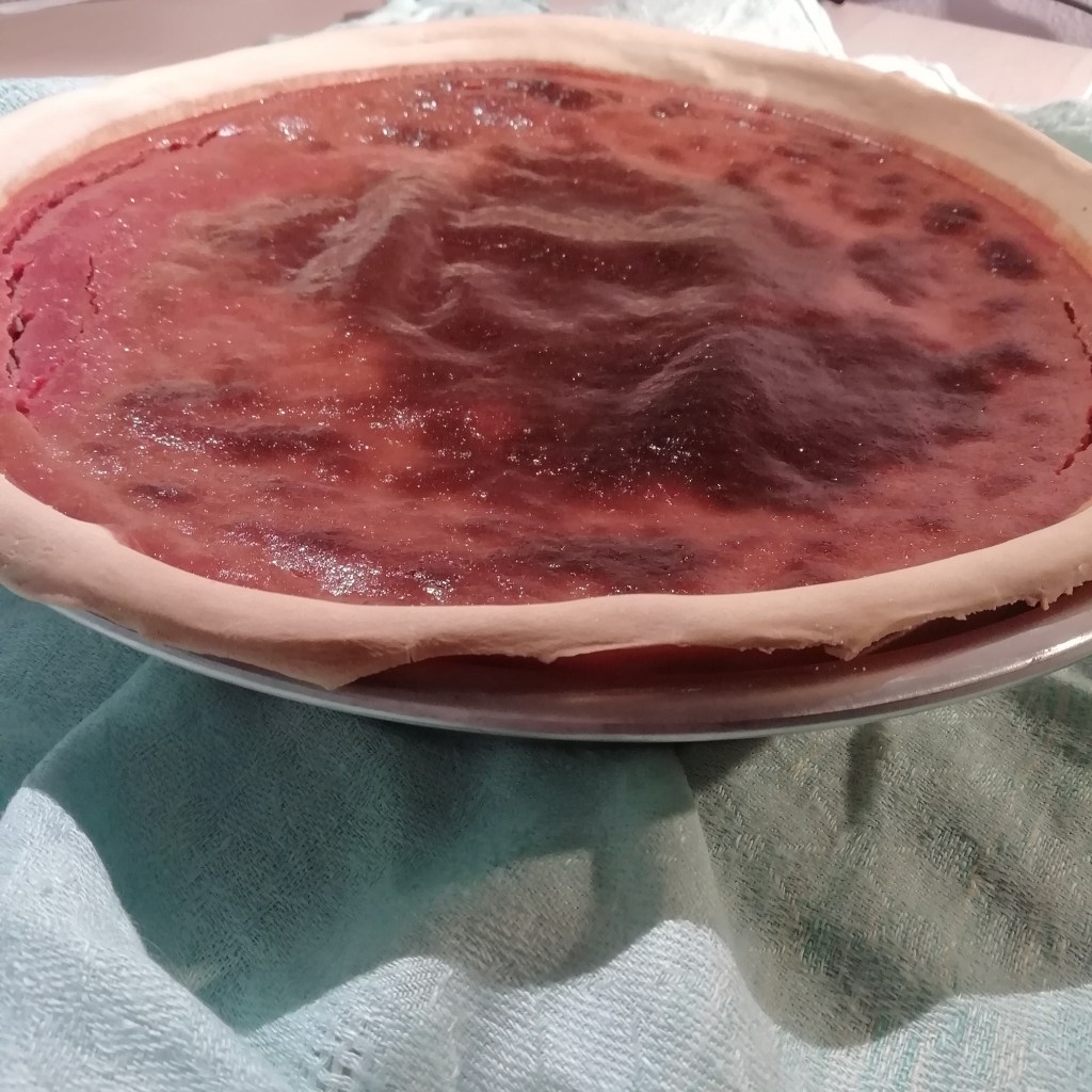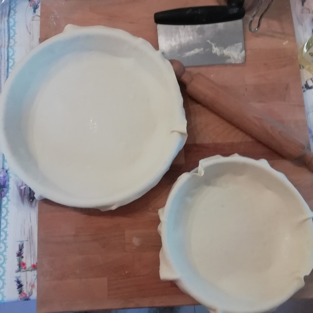 Una volta ottenuto un composto liscio ed elastico lasciamo riposare coperto da una ciotola per 10/15 minuti poi tiriamo una sfoglia sottile con la quale fodereremo una teglia da 28 cm imburrata e infarinata. Stendiamo la sfoglia oltre il bordo perché non ricada all’interno e tagliamo l’eccedenza proprio sotto il bordo esterno. Fate molta attenzione a non forare la sfoglia. Se ciò accadesse, ritagliate un pezzetto dall’eccedenza e, dopo averlo bagnato con acqua, appoggiatelo sulla parte rotta creando una toppa.