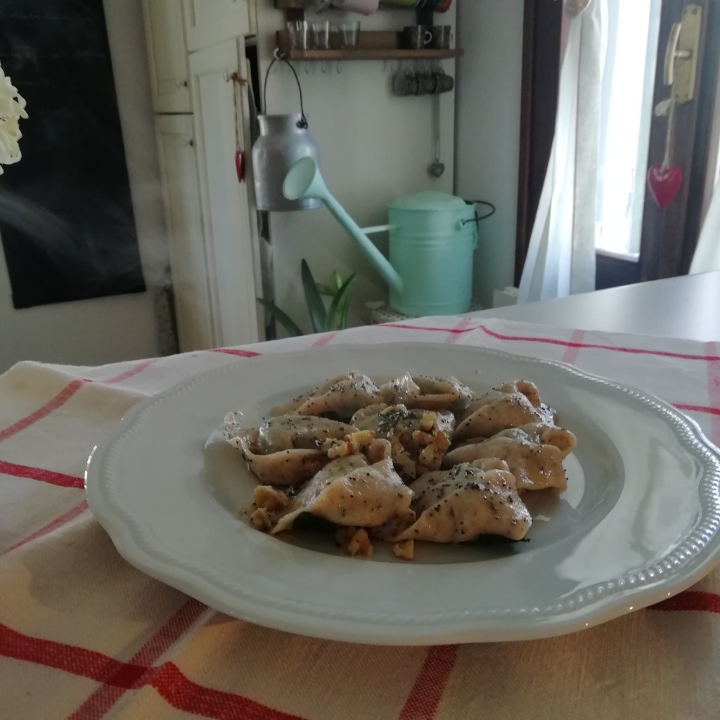 In questo periodo a casa mi piace sperimentare cose nuove e dato che avevo finito le uova di galline felici, in attesa di averne altre e di poter avere il mio pollaio ho provato a farne senza e già che c’ero ho tolto anche i formaggi per provare se si poteva farne a meno ottenendo una pasta ripiena gustosa per tutti i palati.
