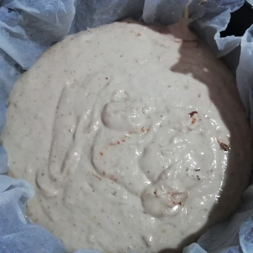 Versare in una teglia da 20 cm foderata di carta forno oppure unta e infarinata.