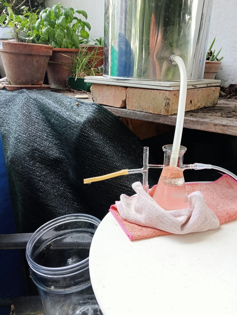 In questi giorni non riesco a concentrarmi su altro, è un lavoro che mi prende e mi impegna totalmente. Devo tenere d’occhio la pressione della caldaia che non salga eccessivamente, la temperatura del contenitore della serpentina perché sia sempre fresco (tramite immissione di acqua) e infine controllare il liquido che scende nel separatore fino al momento magico in cui prelevo il prezioso olio essenziale prodotto.