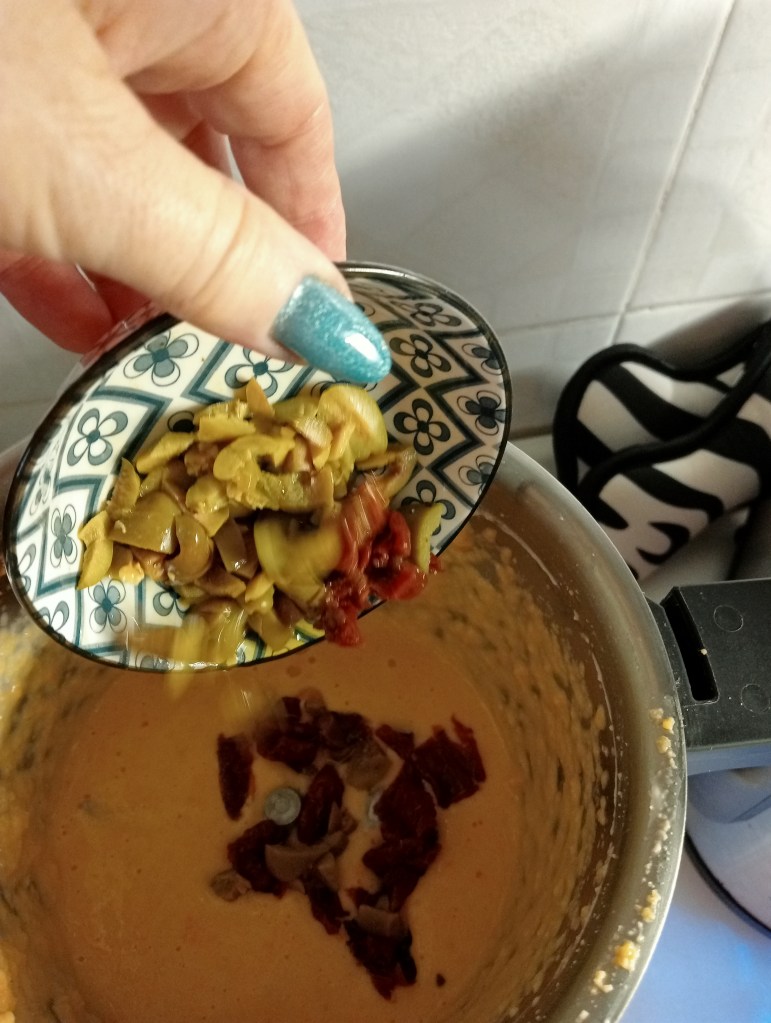 - 1 tazza scarsa – o a piacere – di olive e pomodorini secchi tritati grossolanamente (ma potete aggiungere quel che volete; formaggi, noci, basilico, salvia o quel che vi viene in mente)