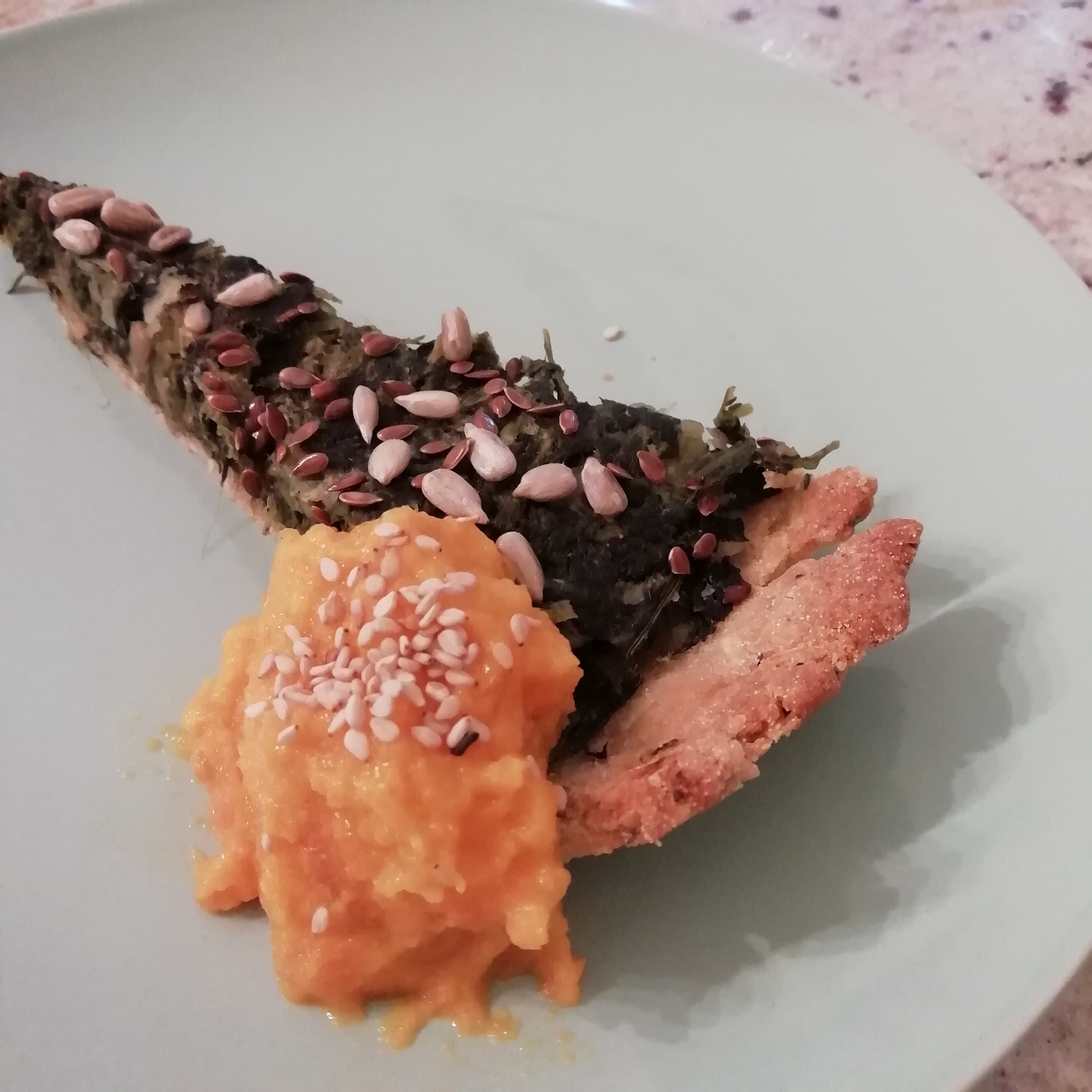 Preparare il ripieno: tritare il cipollotto e farlo imbiondire in padella con olio e magari un po’ di acqua, aggiungere il rosolaccio tritato grossolanamente e la patata schiacciata. Aggiungere il sale e far insaporire un po’. Condire con un po’ di olio, sale, e il lievito alimentare e versarlo sulla pasta brisée. Cospargere con semi di lino e girasole la superficie.