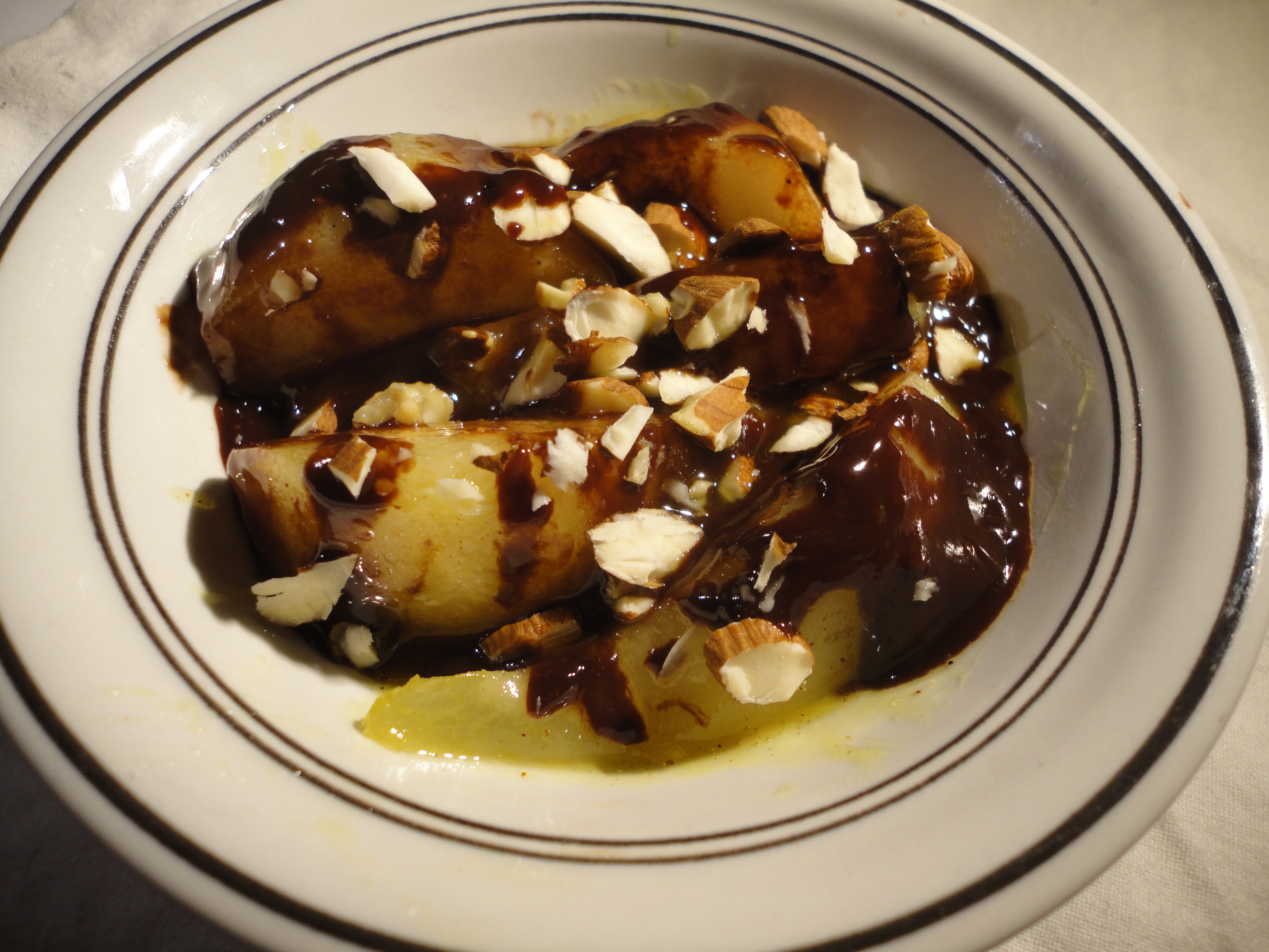 Ho fatto fondere il burro con lo zucchero aggiungendo un poco di acqua, il cardamomo, la vaniglia la pera e la cannella. Ho fatto asciugare e poi aggiunto un altro po di acqua per fare ammorbidire la pera. Ho messo gli spicchi in due coppette e ho salvato il caramello in una tazzina. Ho sciolto con 3 cucchiai di acqua due quadretti di cioccolata fondente e una volta sciolta l’ho messa sulle pere, poi ho versato il caramello della tazzina e sopra le mandorle.